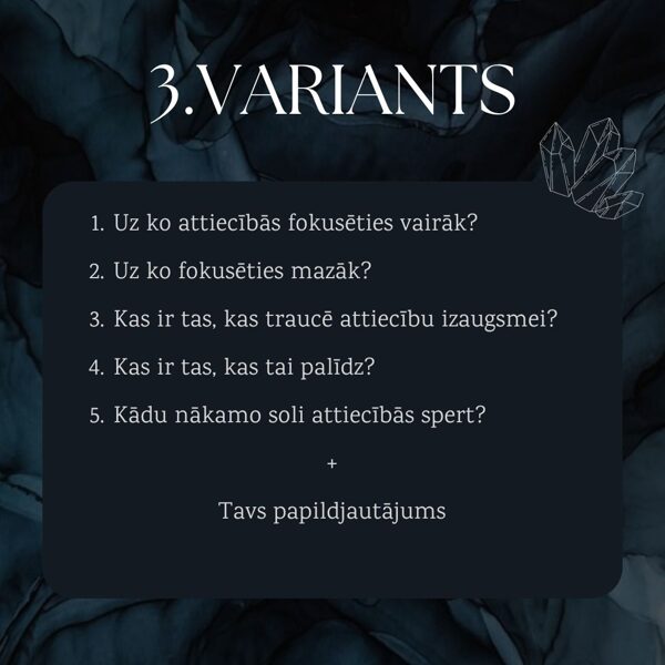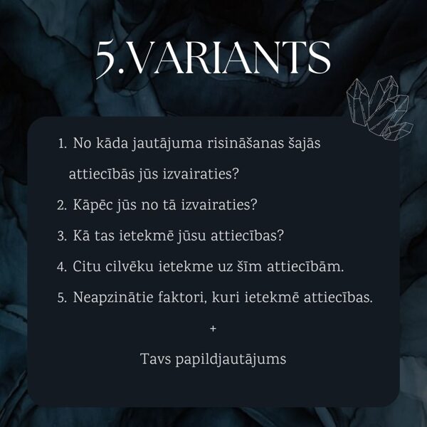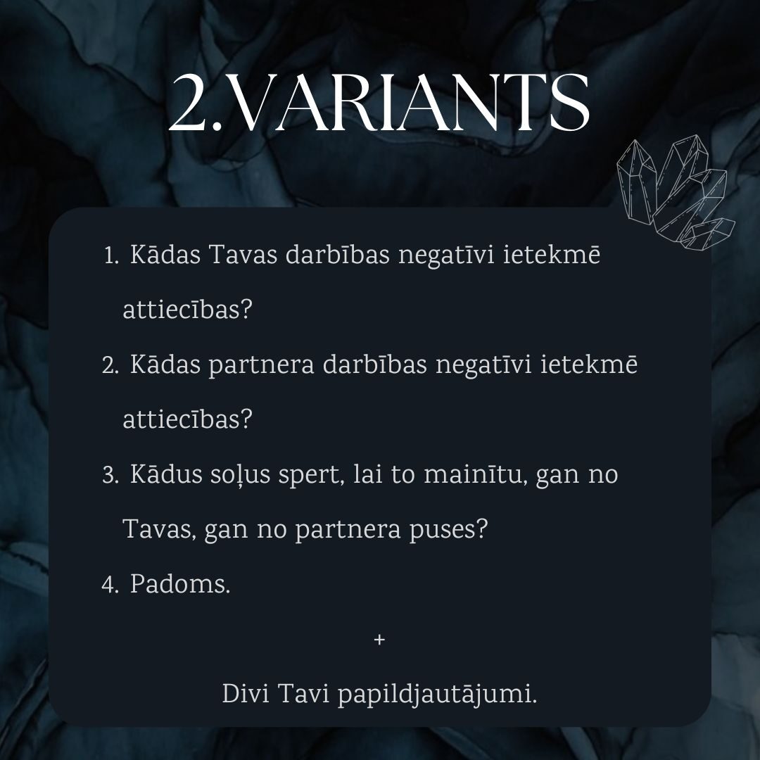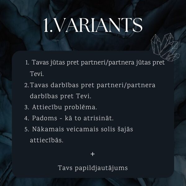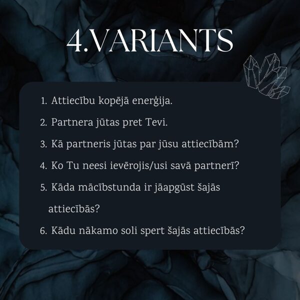 Šie lasījumi ir par attiecību jautājumiem, kuri palīdzēs ieskatīties dziļāk attiecībās notiekošajā. Paredzēti attiecībām ar partneri, radiniekiem, draugiem.