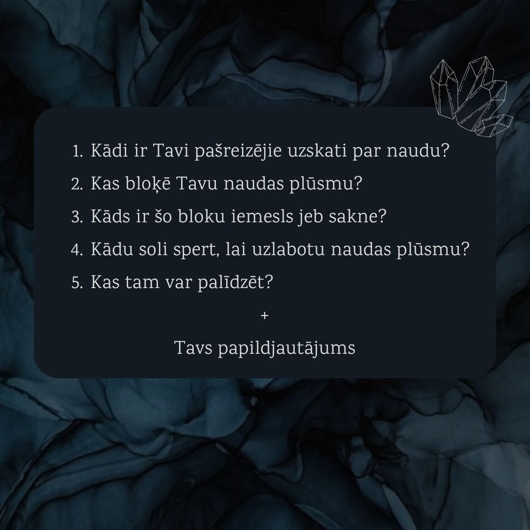 Finanses, tāpat kā jebkas cits, ir enerģija, ar kuru mums ir jāsadarbojas. Apzinoties savu sadarbību ar finansēm jeb šo enerģiju, ir iespēja mainīt savas nelabvēlīgās darbības un uzskatu modeļus, kā rezultātā finansiālais stāvoklis uzlabojas.